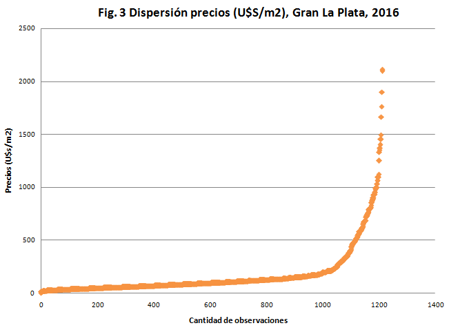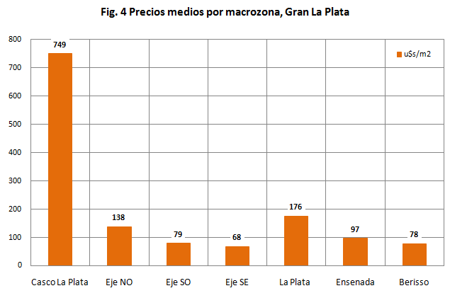 En el año 2016 el relevamiento de 1.659 observaciones dio lugar a 1.215 observaciones asociadas a uso residencial de lotes de menos de 2.500 m2, con un precio medio de 170 u$s/m2 (fig. 2 y 3). Dichos valores presentan heterogeneidades entre los distritos del aglomerado que reflejan el nivel socioeconómico de la demanda y la población residente de los mismos, del mismo modo que los corredores de crecimiento urbano al interior del partido de La Plata y el contraste del área central con alto potencial constructivo (fig. 4).