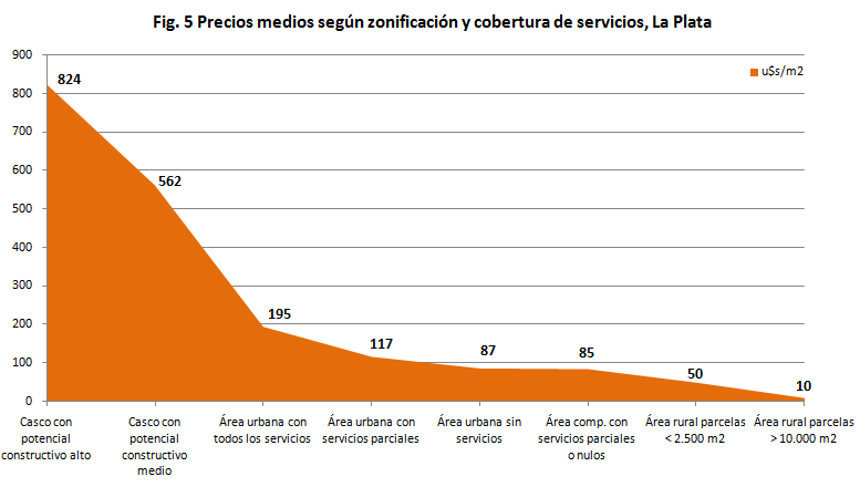 En el caso del partido de La Plata (fig. 5), el entrecruzamiento de las observaciones de precios con la normativa de usos del suelo, la cobertura de servicios, el potencial constructivo y la antigüedad relativa de distintas área del distrito permitió reconstruir un perfil de precios. La diferencia bruta entre los valores de la tierra rural y el suelo urbano sin servicios es del orden del 800%, la brecha entre los precios del suelo de las áreas urbanas bien servidas pero con bajo potencial constructivo versus las áreas con potencial constructivo medio o alto ronda un 300-400%, y la diferencia en área urbana entre suelo urbano servido y sin servicios asciende a más del 200%.