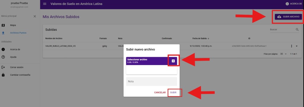 C. Luego, selecciona “Subir Archivo”, y haz click en el botón “+”. Esto permitirá cargar tu archivo de puntos en distintos formatos (ZIP, GPKG, SHP, Excel, entre otros) respetando el formato establecido en el siguiente documento (Estructura de datos).